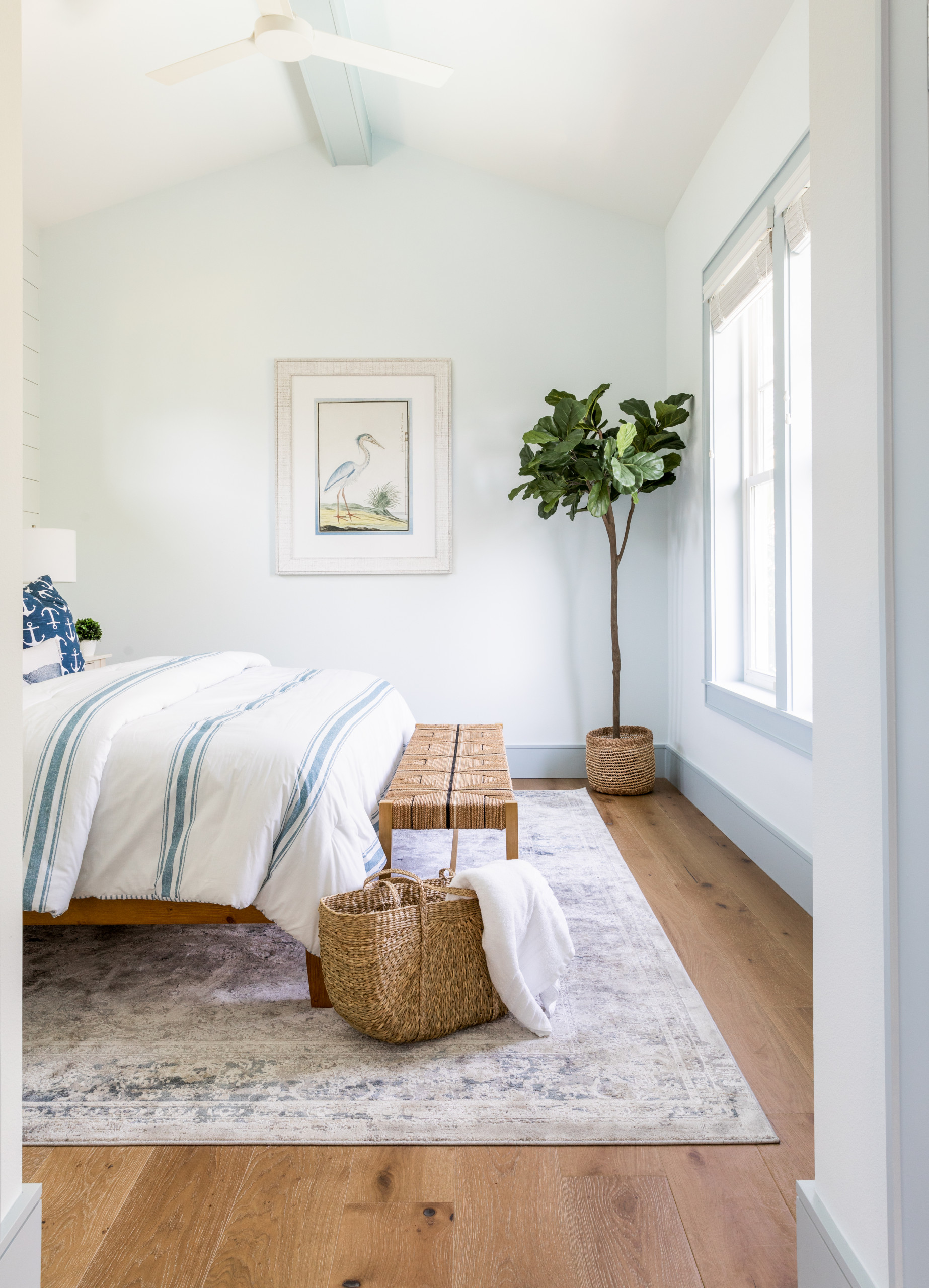 Measure the distance between your footboard and the opposite wall or dresser, then, when shopping, deduct the depth of the bench that’s caught your eye. You’ll need about 3 feet of clearance left over for circulation. Also aim for the bench to be chair-height and slightly shorter than the width of your bed.