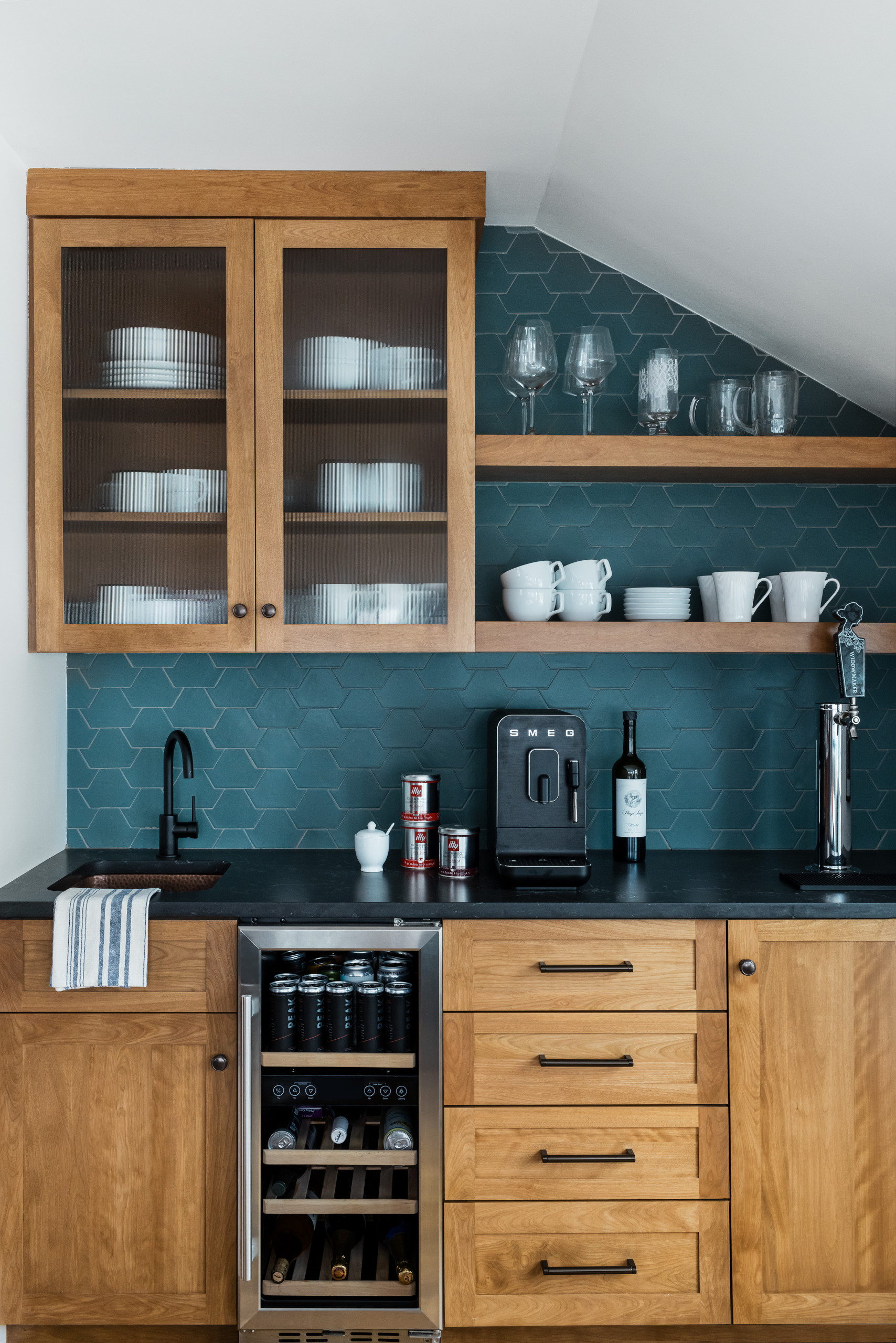 This beverage and coffee station in Melrose, Massachusetts, is part of a kitchen remodeled by lead designer Amy Tangorra and her team at Our House Design + Build. It has a wine fridge, a copper prep sink, a soapstone-look engineered stone countertop, reeded glass doors on an upper cabinet, a beer tap and open shelves for glassware and mugs. The warm wood cabinetry coordinates with the kitchen cabinets, and the backsplash’s handmade leaf-shaped teal tiles coordinate with the banquette and dining chairs that sit just across from it.