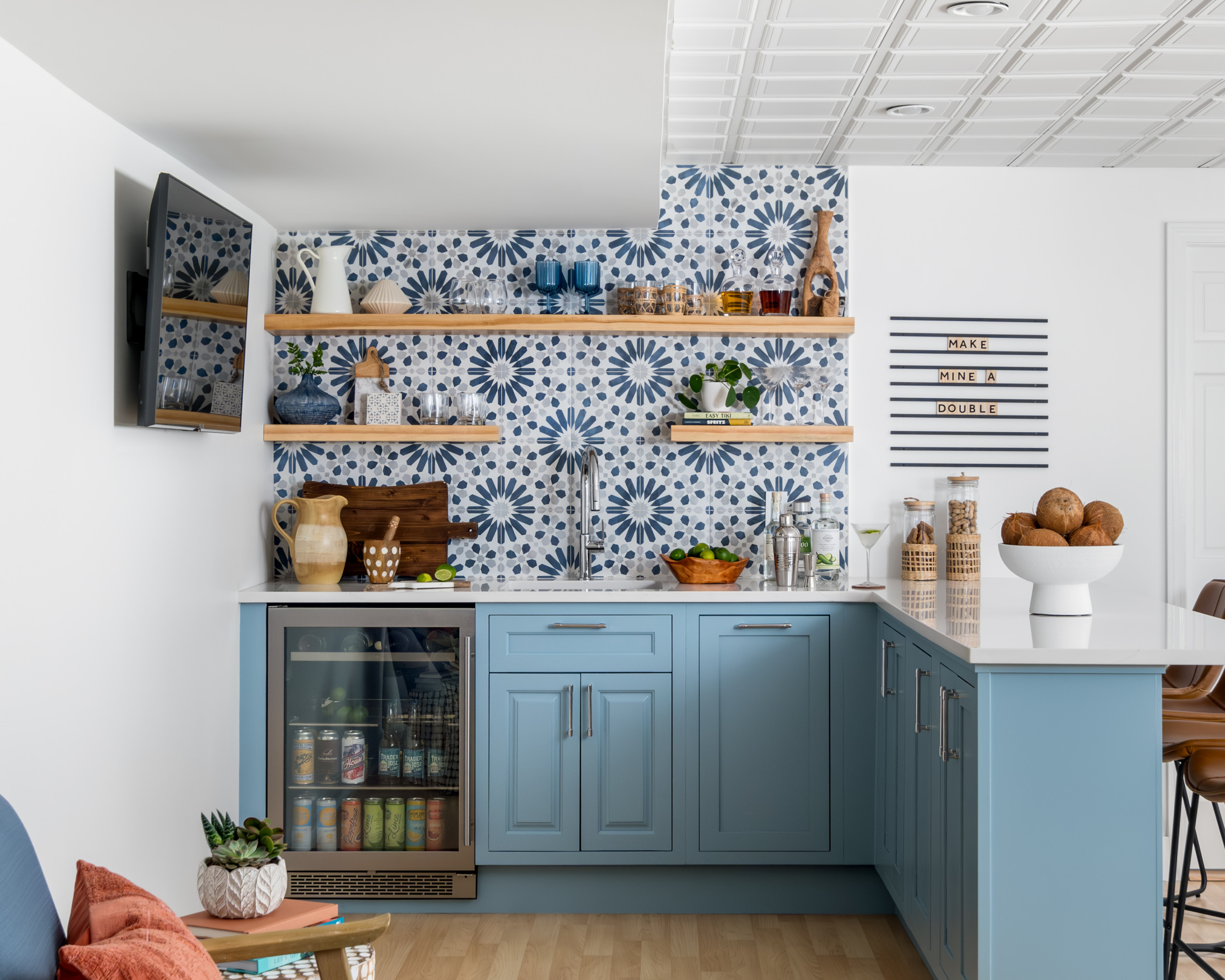 Brittany Truett of design firm True Revival gave a Wrentham, Massachusetts, basement wet bar “Cali-cool modern style” with slate blue inset cabinets, happy geometric backsplash tile, light wood floating shelves and surf-themed artwork. The basement leads out to a pool, making the L-shaped bar — which has a TV and seating for four — especially popular when the family entertains during the summer.