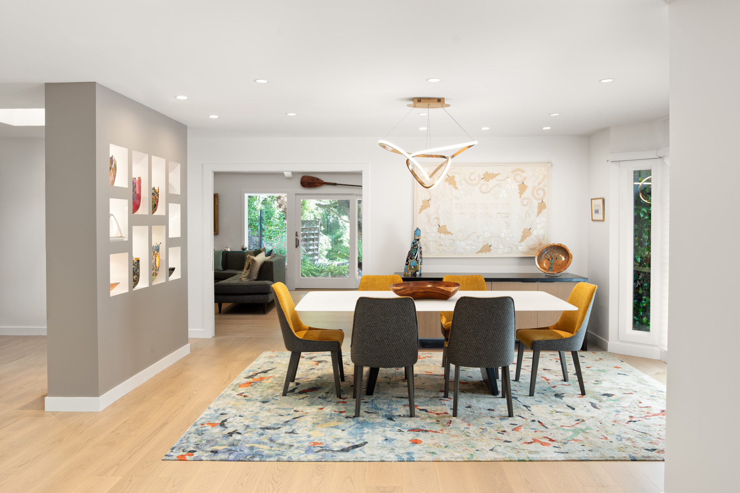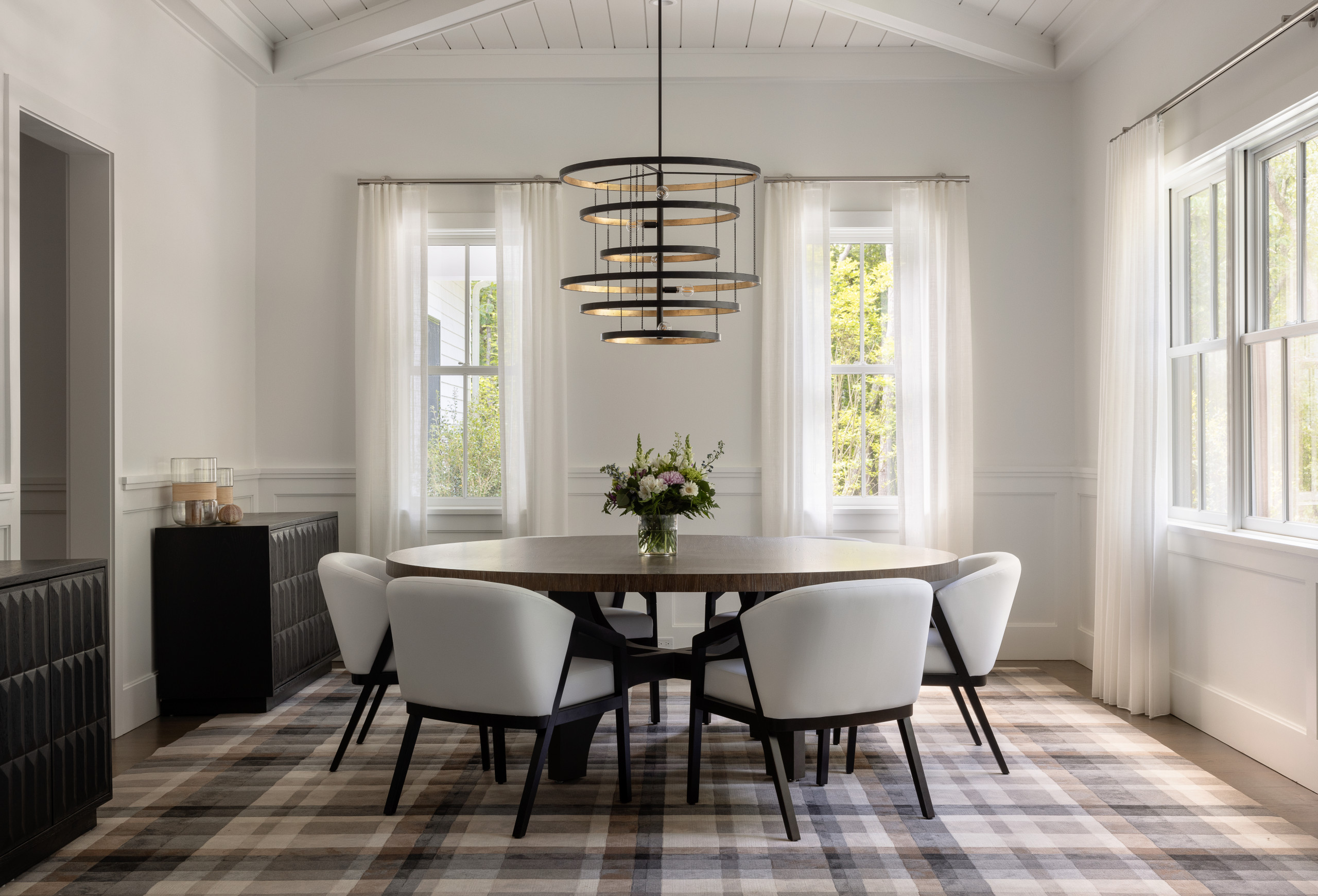When choosing a color and pattern for your dining room rug, look at it as a piece in the larger puzzle of your space. What color are your dining chairs and table, light fixtures, flooring, and wall color? If you have an open floor plan, what other rugs are you already using in the space? The rug you ultimately choose should fit naturally with these other pieces.