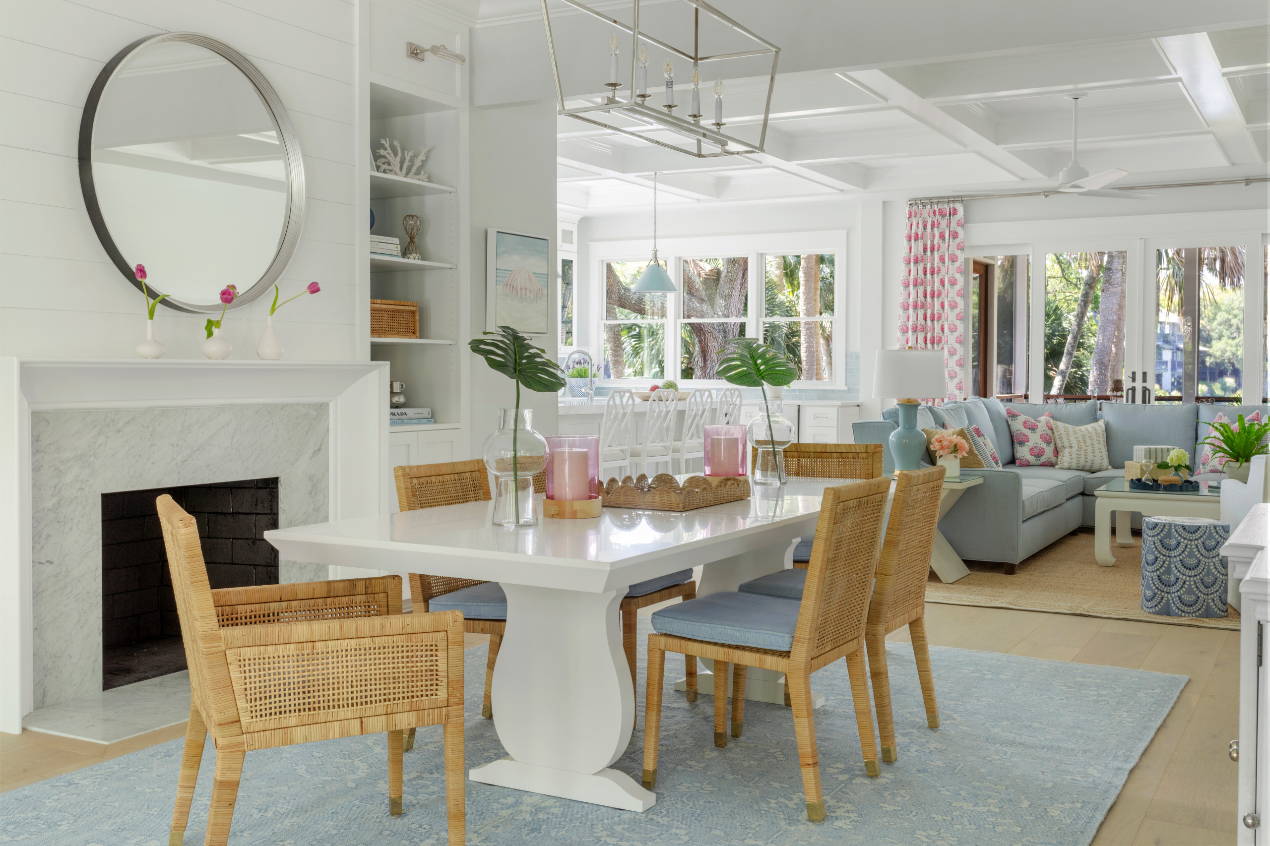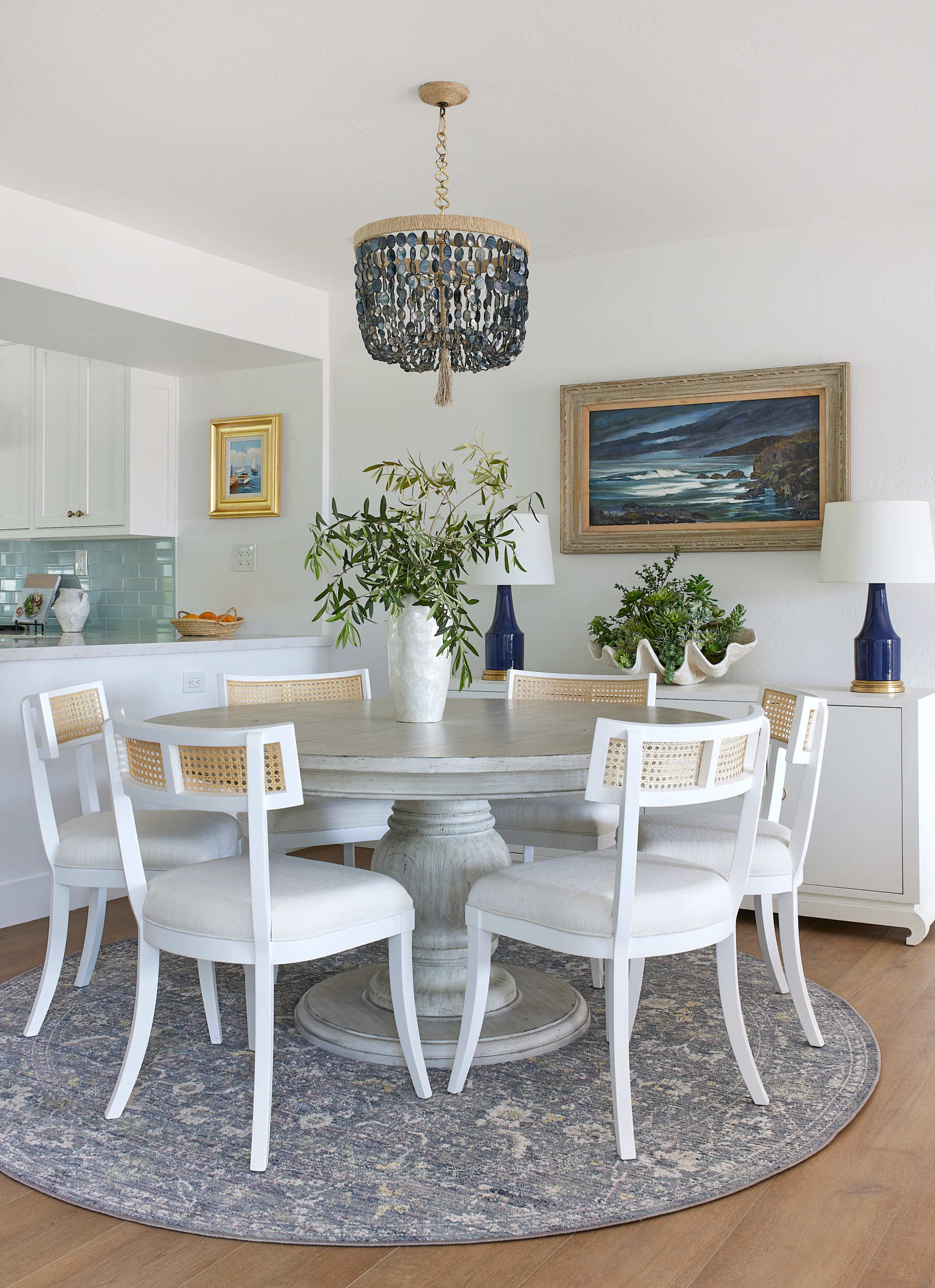 Unless you use your dining room more as a workspace than for dinner parties, it may be best to avoid white and light-colored rugs in this space (as beautiful as they look). A pale hue is going to show dirt and spots sooner than deeper, richer colors.