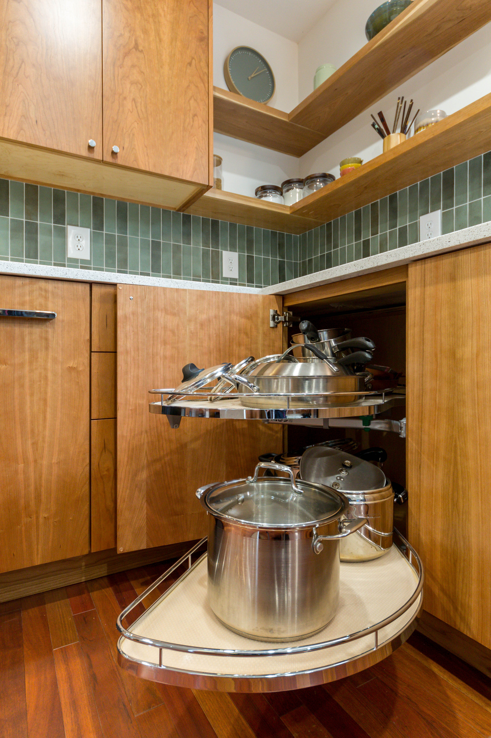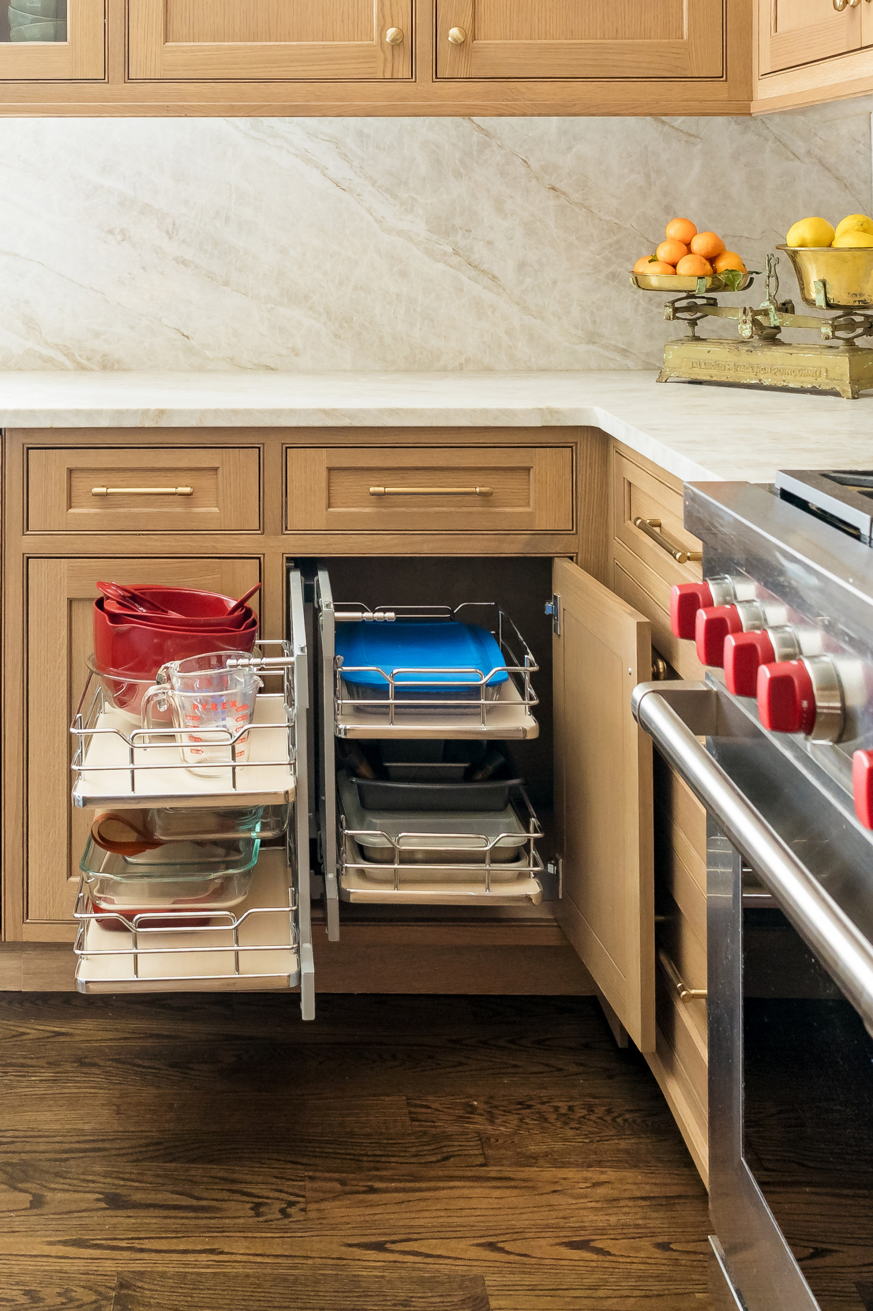 Blind corner cabinets won’t cut it. Yes, they provide ample storage space, but too often they turn into unofficial junk bins when you tire of getting on all fours to fetch the dish you need. Performing that bend-reach-lift motion also isn’t good for aging backs.