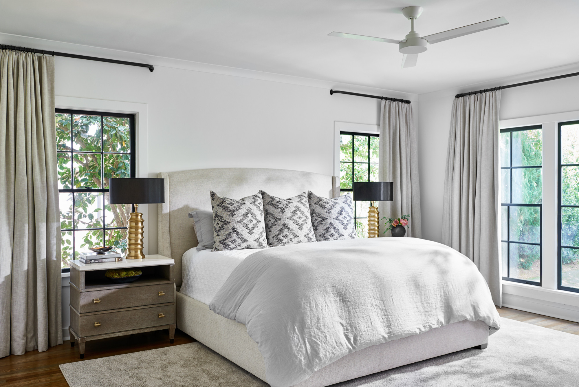Elle Du Monde LLCNo dream home is complete without a comfortable, relaxing bedroom. The breezy style in this Atlanta bedroom by Elle Du Monde is a good example. The palette is calming, but a few dramatic touches of black and gold keep it from being boring. There’s also simple, plush bedding and curtain rods placed near the ceiling to emphasize the height of the room. The rods are also sized wide enough so the curtains fully cover the window area, preventing light from leaking in.