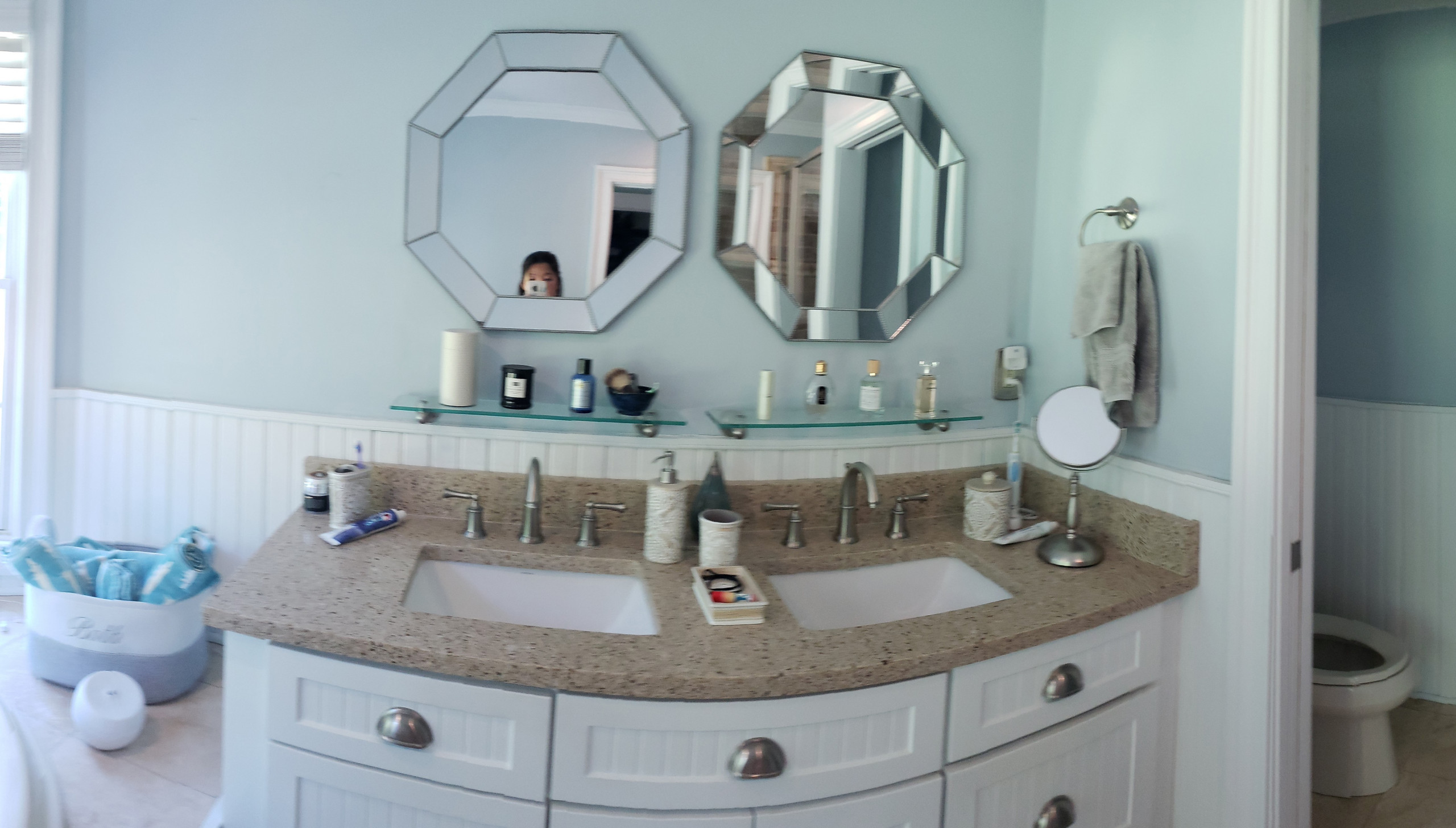 After: The new palette sets a fresh, bright tone, while artwork and an antique-looking rug add character. Two wall mirrors replaced one long mirror running the length of the previous vanity, allowing for more light via sconces on either side of both.