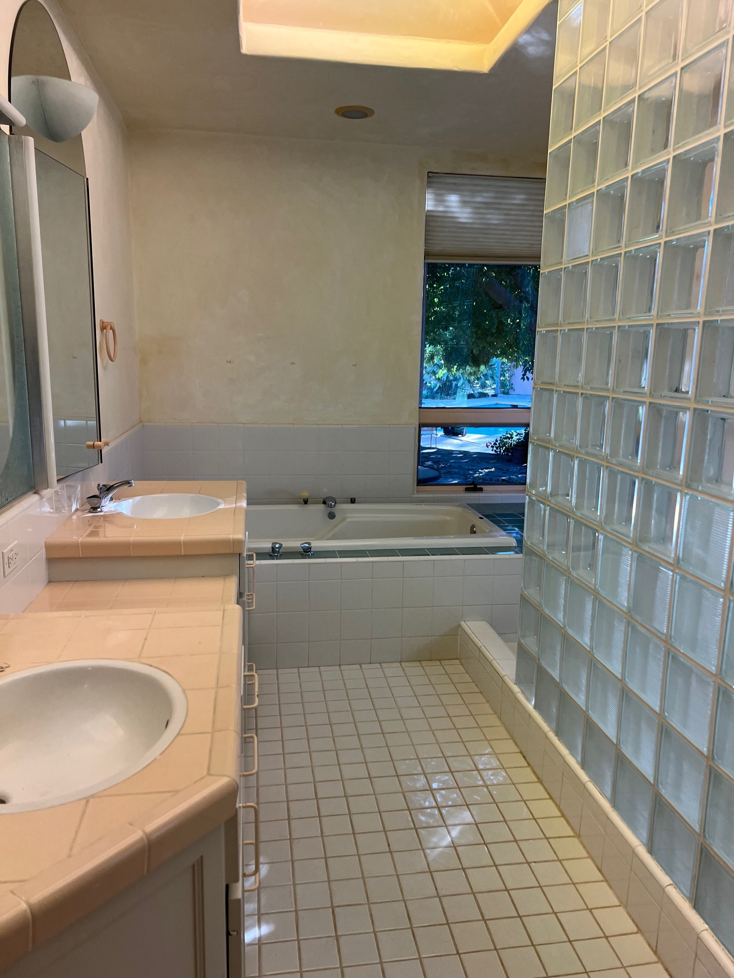Before: A daunting array of hard-to-clean grout lines, a glass block wall that lived up to its name by blocking light and views, and a narrow floor area and constricted feel — those were the issues that the homeowners, a retired couple in California, asked designer Lori Wallick to address. Also on the to-do list: better storage and lighting and an accessible shower.
