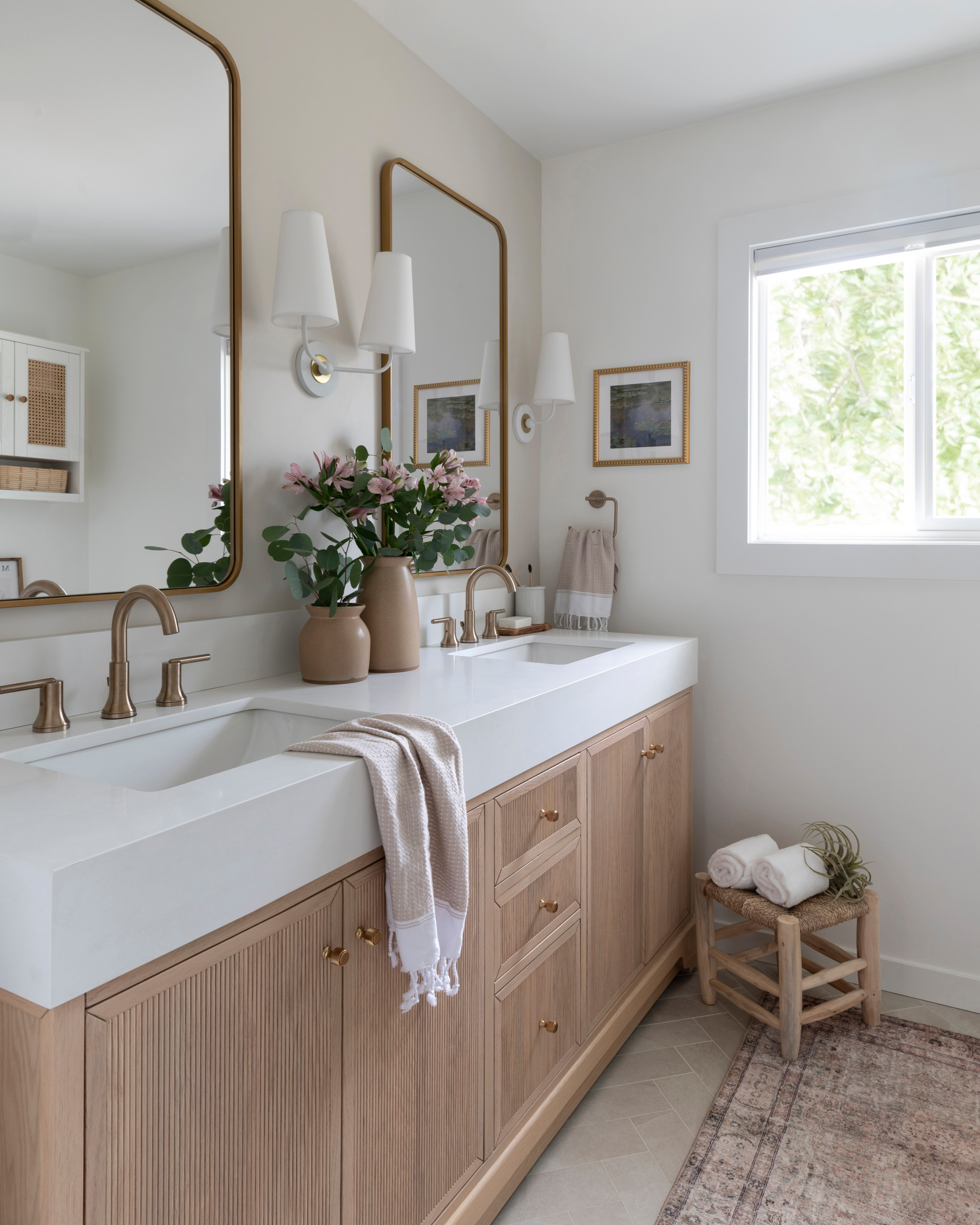 The new white oak double vanity has been customized with reeded fronts for a bit of interest. It also has a thick white quartz countertop, lending a modern look.