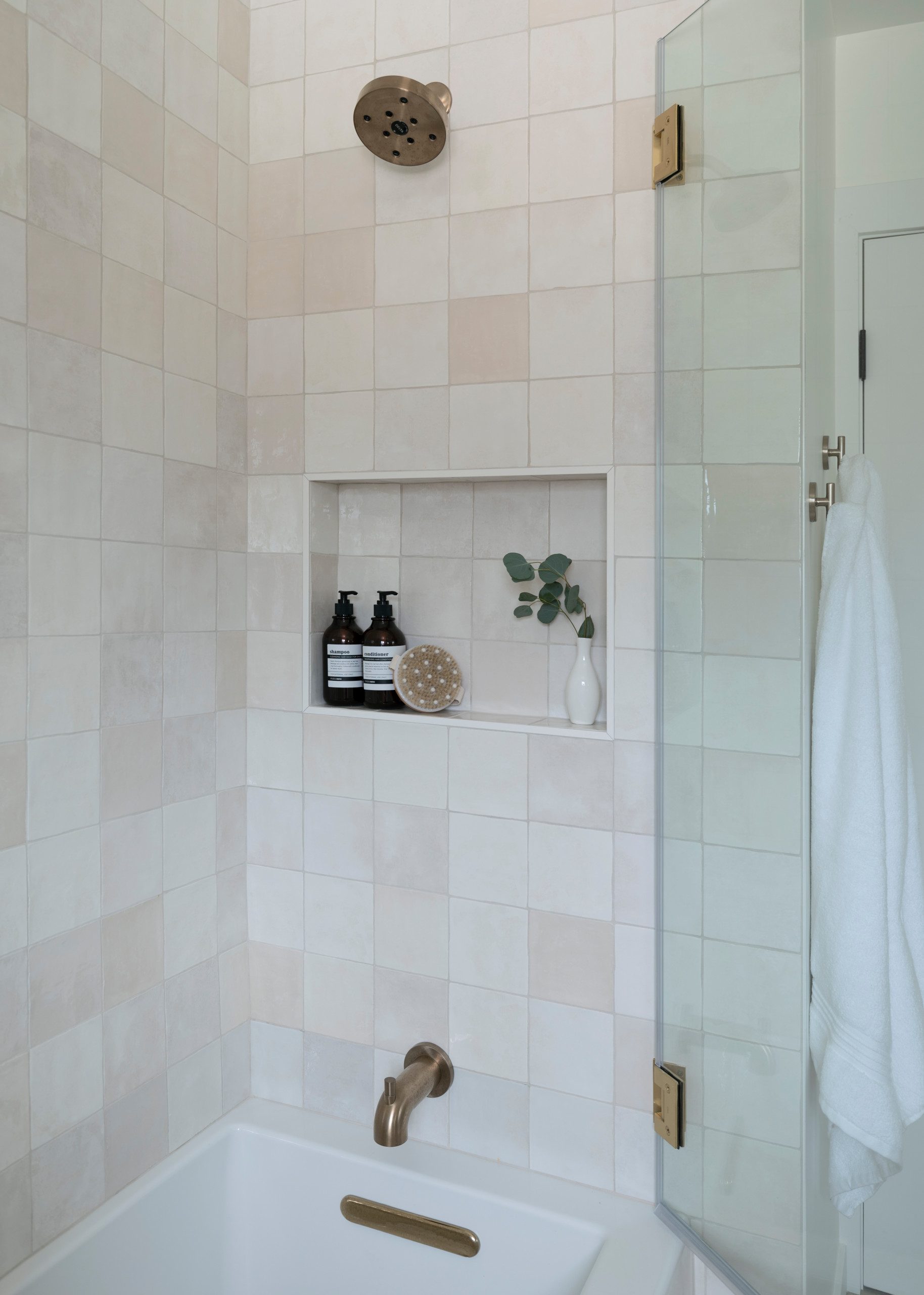 Because they’re large-format, the porcelain tiles on the main floor and shower walls have less grout to clean. But the shower floor is composed of 2-by-2-inch tiles, as the extra grout helps create a nonslip surface.