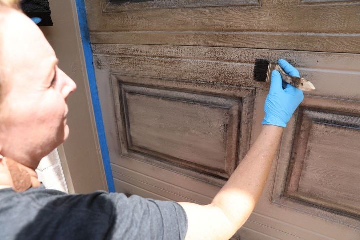 Now the fun part! Time to stain! I started with Old Masters Gel Stain in Spanish Oak. I am using a chip brush and outlining most of the recessed areas to give the door some dimension. You do not have to be meticulous! Brush the stain into the areas and then come back with a piece of cheesecloth or sponge and soften your edges and blend it to your liking.
