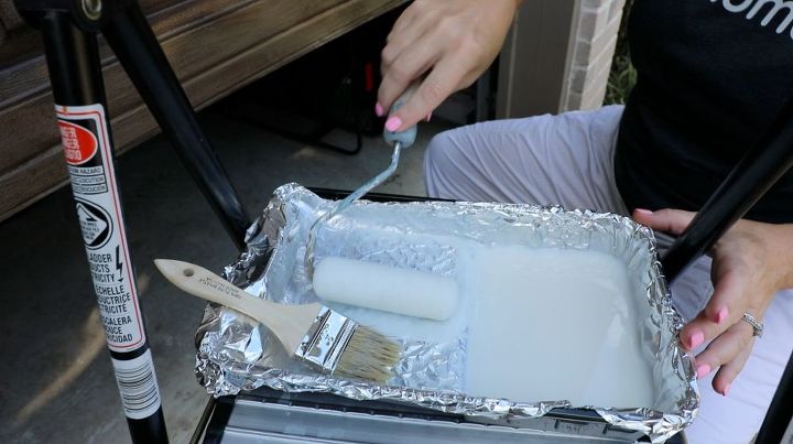 Next step….PAINT! Tape off anything areas you want to keep free of paint. Mix your paint well and pour into your lined tray. I use aluminum foil to line my tray and a 4 inch foam roller to roll the paint onto the door. I keep a paint brush handy for the edges and any nooks and crannies that the roller cannot hit.