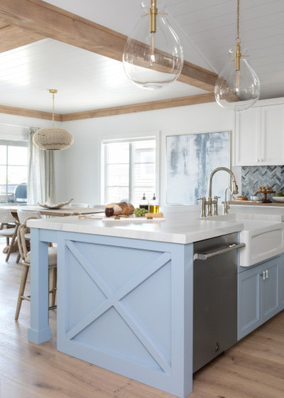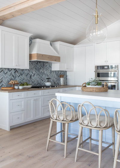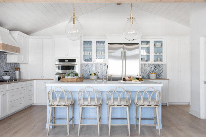 Glass tiles in varying blue tones are set in a herringbone pattern for the backsplash. “Glass is easy to clean,” Wolf says. “It’s a great material for a beach house because you can just wipe it down.”