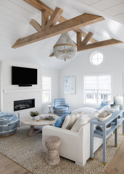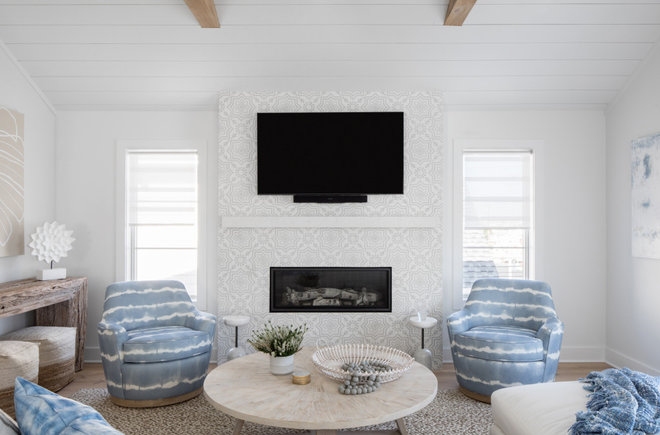 She also carried blues throughout the living room furnishings for design cohesion. She color-matched the blue from the island for the linen-wrapped console table behind the white sofa. She then used blue tie-dye fabric for two custom chairs.