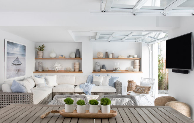 She spent a lot of time on styling the open shelves behind the outdoor sectional. “Shelves are tough, even for designers,” she says. “It’s a lot of trial and error. And a lot of it is about scale.”