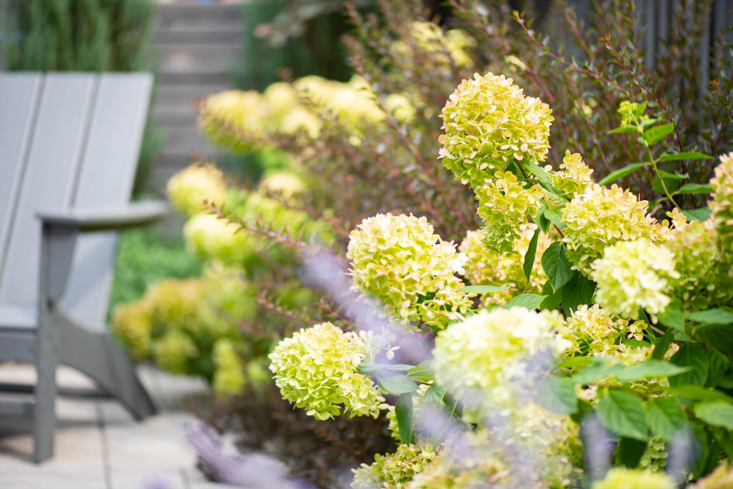 Here’s a closer look at the row of ‘Little Lime’ panicle hydrangeas (Hydrangea paniculata ‘Little Lime’, zones 3 to 8) lining the back side of the patio. There’s also a peek at some catmint in the foreground. These plants attract pollinators, and Himschoot reports that birds, butterflies and bees love this yard.
