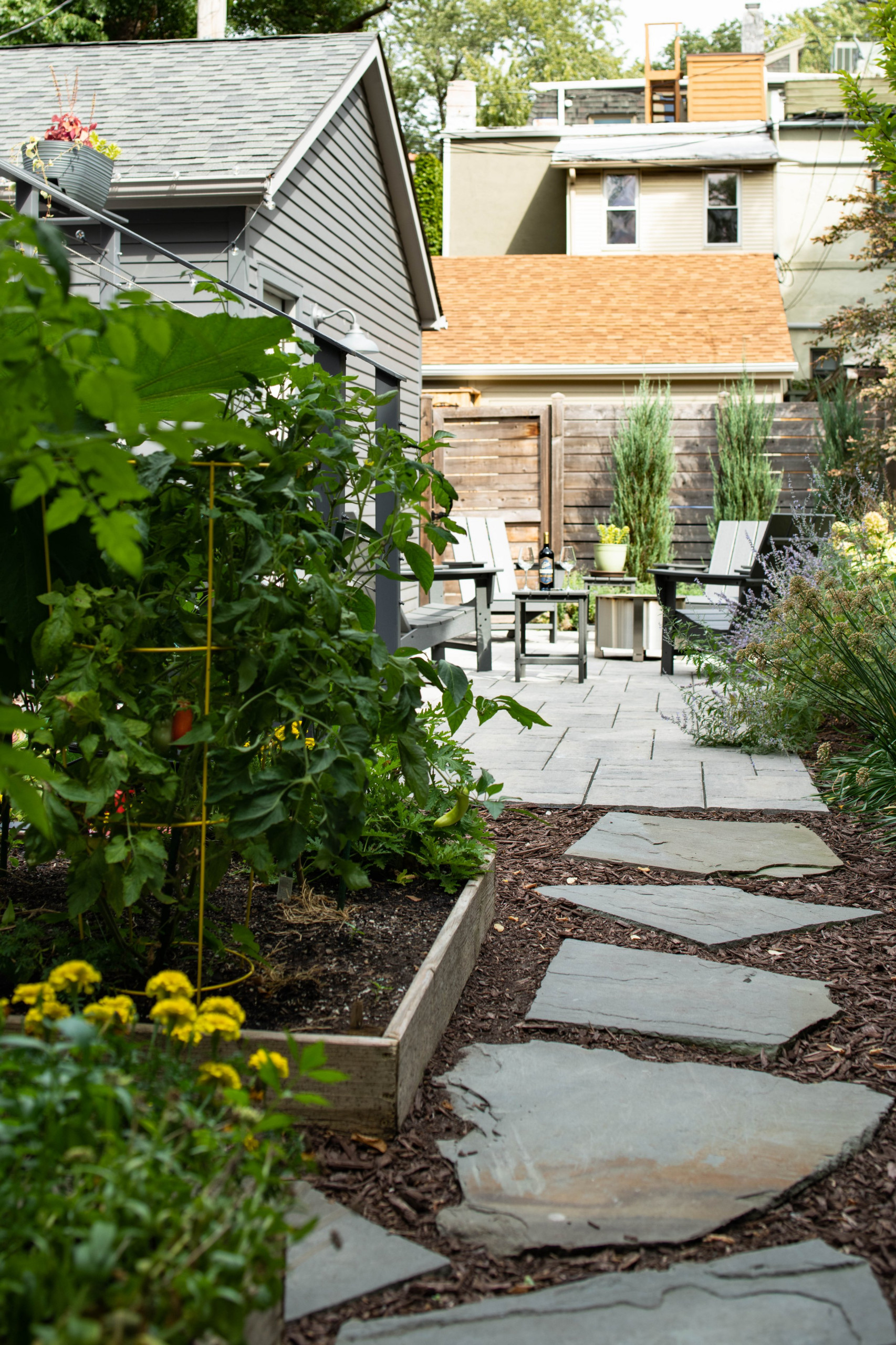 flexible patio, edible plants and pollinator attractors to a charming Chicago home. (cited)