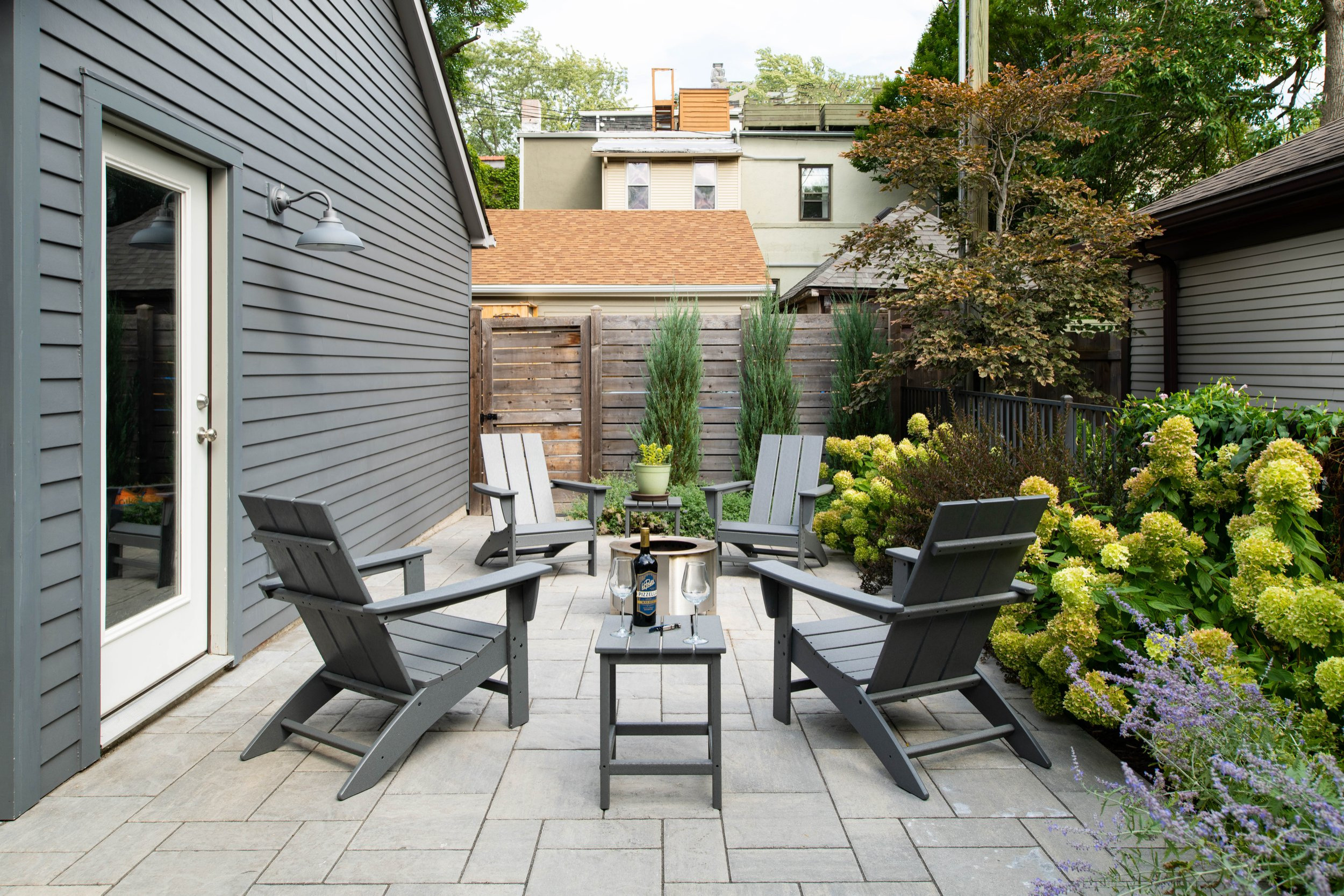 Accordingly, he suggested a clean-burning, moveable Solo Stove rather than a permanent fire feature. It suits this tight-knit neighborhood, as it doesn’t emit smoke and won’t disturb the neighbors. The modern Adirondack chairs are made of recycled plastic. They are comfortable but also relatively easy to move out of the way.