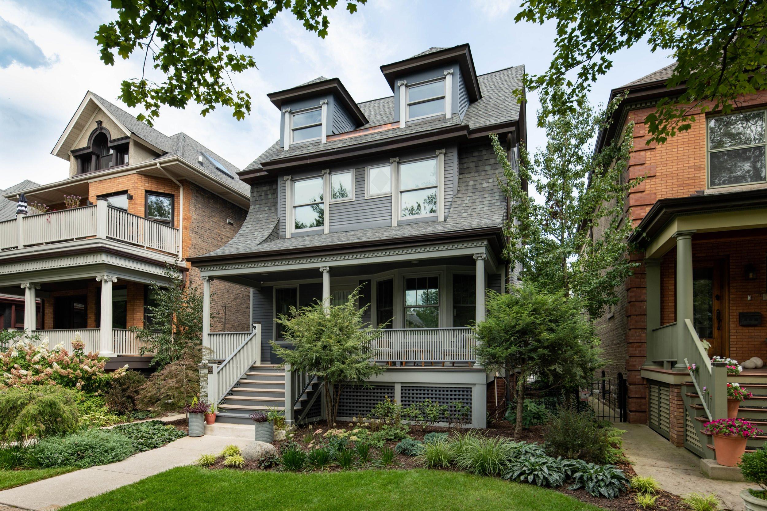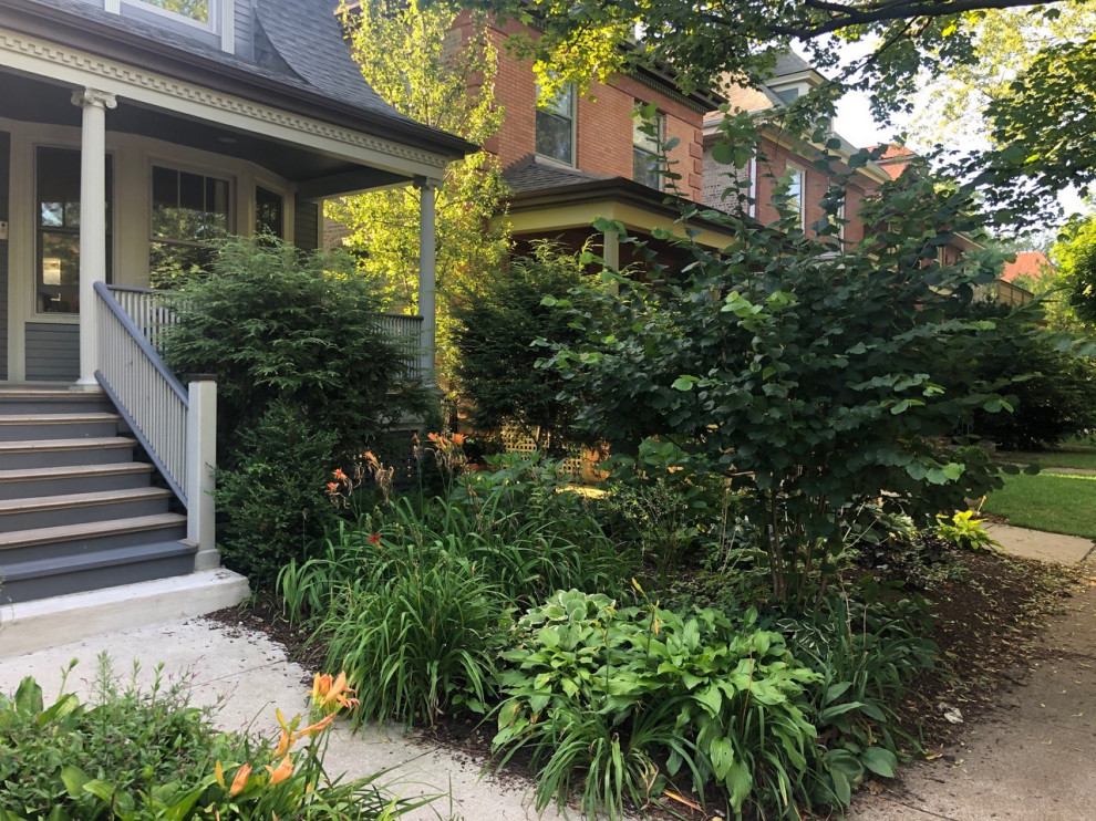 Before: The home is located in Chicago’s historic Lakewood Balmoral neighborhood, which is full of charming homes. The existing yard was overgrown and a bit unwieldy. The homeowners wanted to preserve two existing hemlock trees, one of which can be seen to the right of the porch stairs here. Himschoot also saved the tall tree located off the right side of the porch.