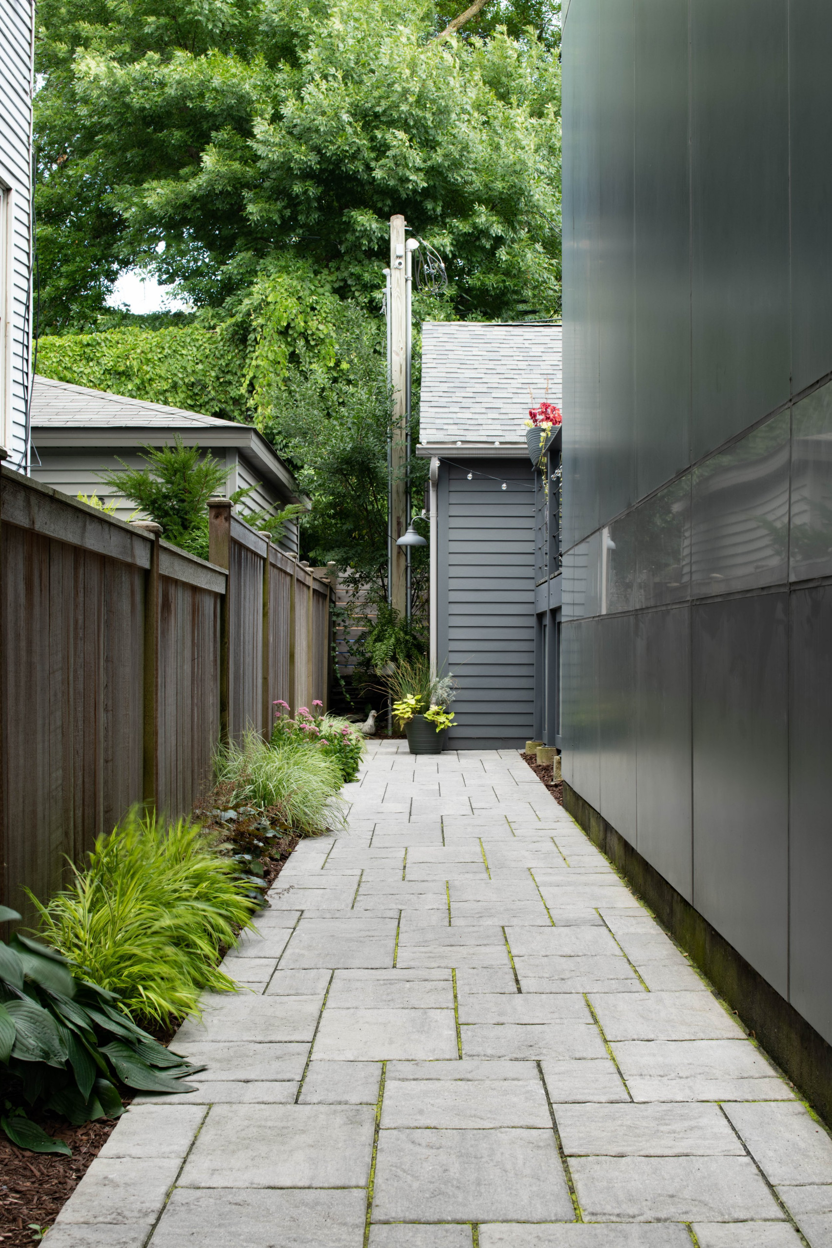After: Himschoot used Techo Bloc Blu pavers for the paths and the new back patio. Guests coming to hang out for a patio party can open the gate on the street side and take this walkway. On the right side of the photo there’s a peek at the existing deck, which was in great shape. Around the corner, a narrow pathway between the deck and the garage leads to the new patio.