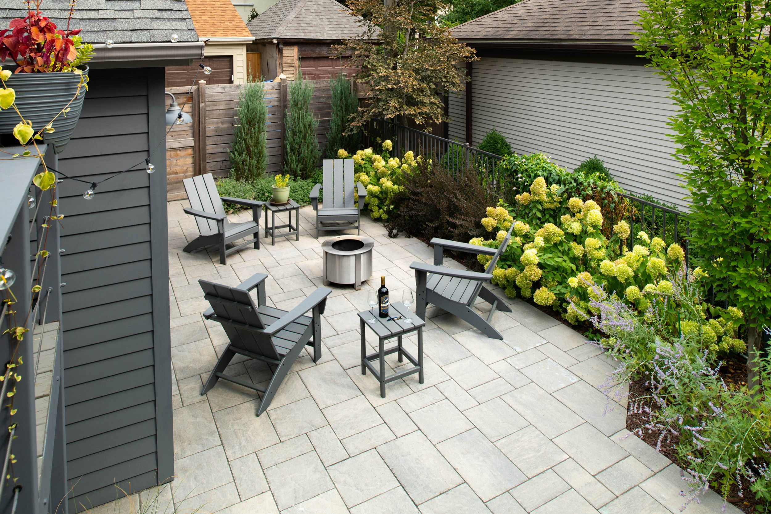 After: This new patio, located in the back-right corner of the lot, was the impetus for the entire project. The garage, seen here on the left, occupies a good portion of the backyard. “There is not a lot of space in this yard, so we made the most of every inch,” Himschoot says. “My clients wanted the space to be flexible so that their kids could put the furniture aside and put up the soccer net for shooting practice.”