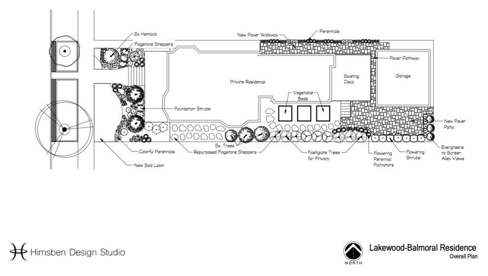 Site plan: This plan, from left to right, runs from the street to the back of the property. The new paver path is located along the top of the plan. From there, a skinny path runs between the deck and the garage to the patio, which is located in the bottom-right corner of the plan. The three squares below the house are the edible garden boxes.