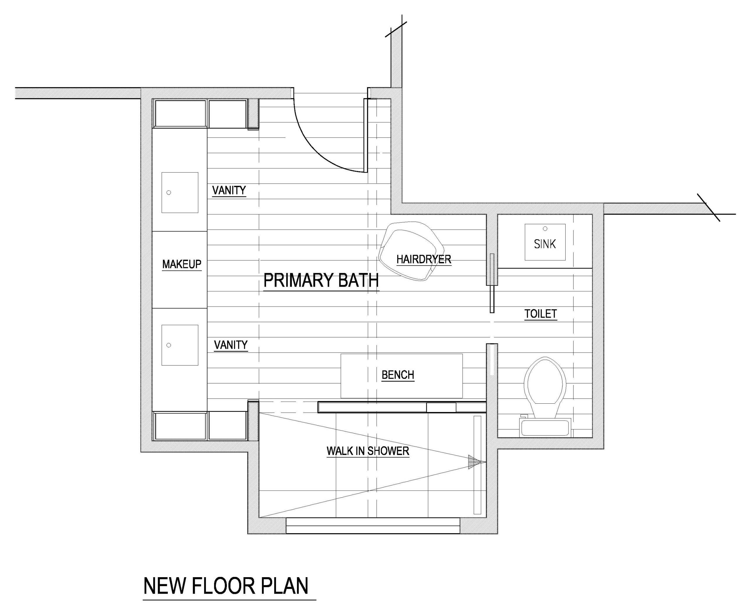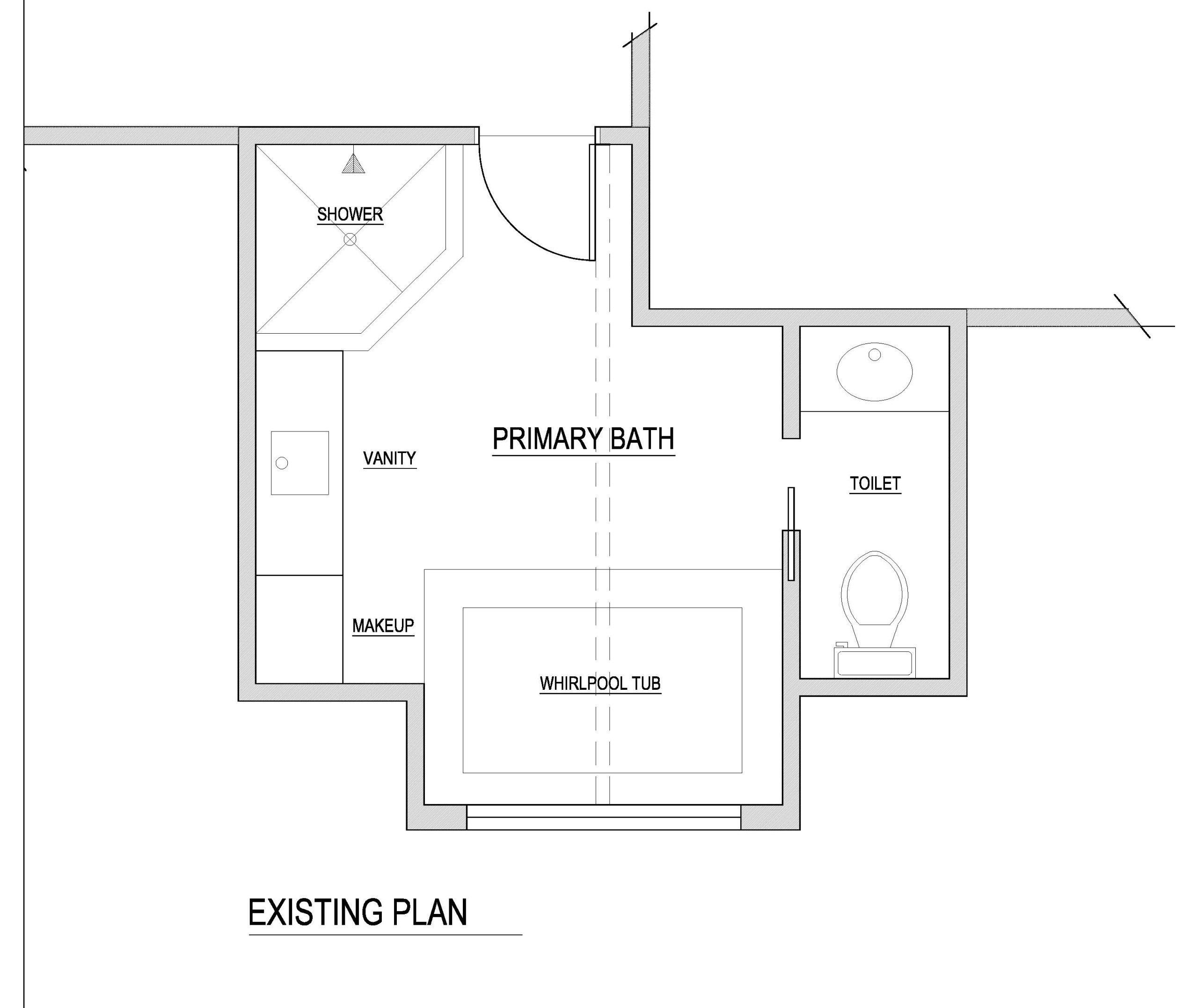 Before: Here’s a look at the layout of the former bathroom. The corner shower with glass-block doors (upper left) was crammed together with the single-sink vanity (middle left). The massive built-in tub (bottom) overwhelmed the space.