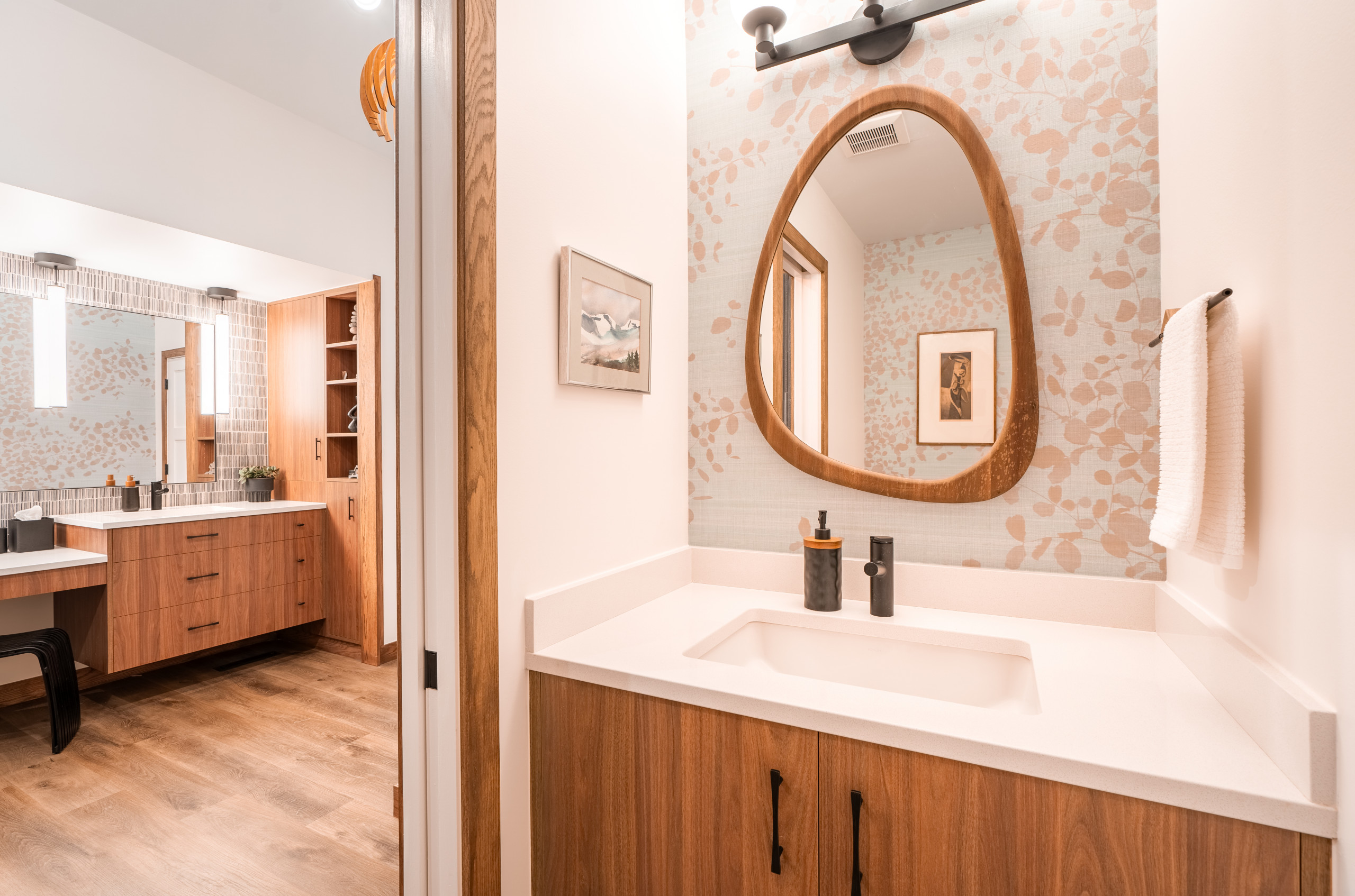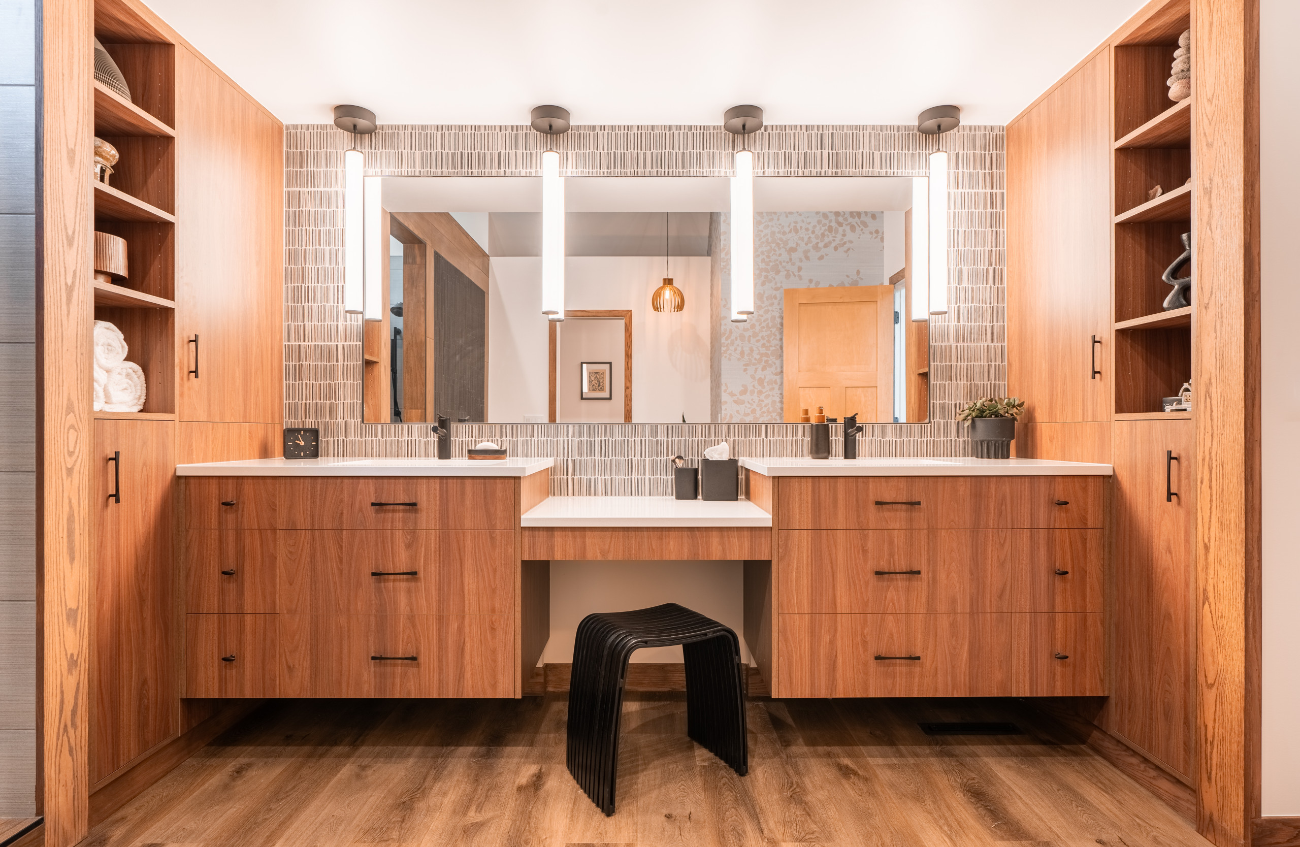 Four damp-rated 25-inch black LED linear pendant lights hang in front of a custom mirror. “I’m increasingly using pendants in bathrooms to get better lighting on people’s faces,” Lundin says. Luxury vinyl plank wood-look flooring adds warmth and durability.