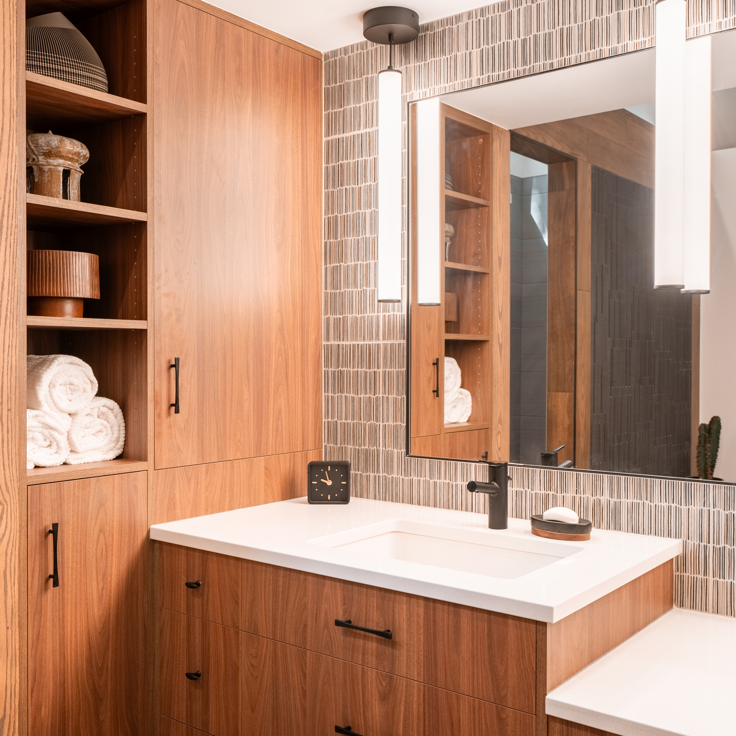 Built-ins flanking the vanity have a combination of large cabinets and open shelves that offer easy access to towels and other essentials.