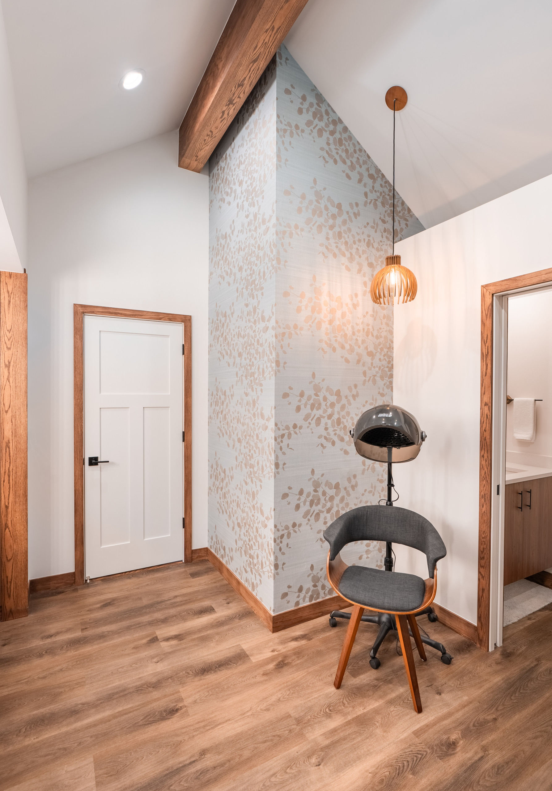 After: Lundin ditched the freestanding cabinet. In its place is a pro-style bonnet hair dryer and midcentury-modern-style chair that gives the wife a relaxing spot to dry her hair. “It’s a spa-like feature for her,” Lundin says. “That pendant above also signifies this is a special spot now. It breaks up the room too. Not everything has to be symmetrical.”
