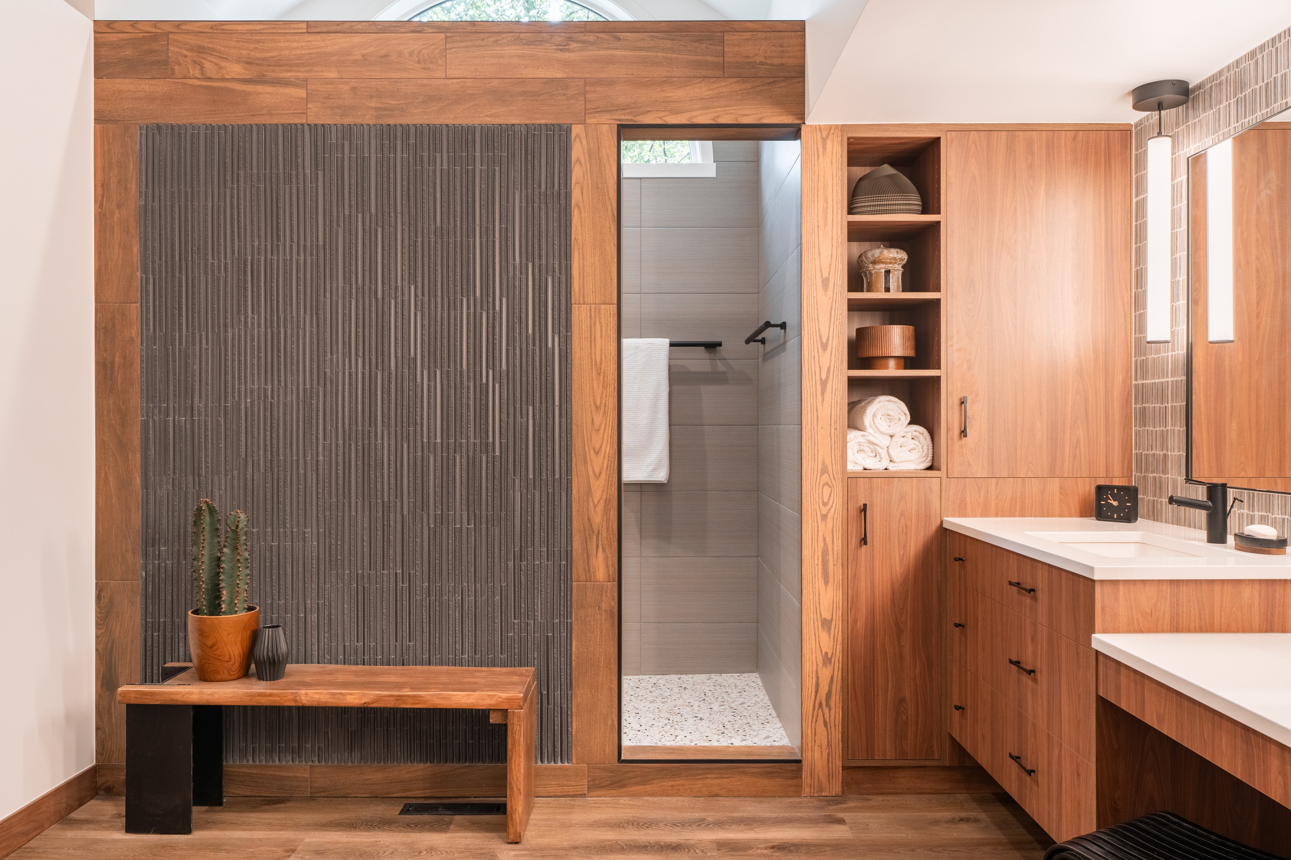 After: Lundin removed the tub and picture window but kept the arched window, which he integrated into the new low-curb shower. Wood-look porcelain tiles frame the shower enclosure with visual warmth. The exterior wall of the shower has Japanese-inspired matte black field tiles in a staggered vertical pattern with black grout. “They really add depth and texture to the room,” Lundin says. “We all fell in love with that tile when we found it.” The wall, which is open on top, gave the couple a way to separate the shower without the need to clean a glass door or replace a shower curtain. “It was a way to cut down on regular maintenance,” Lundin says. “It looks nice and allows light inside the bathroom.”