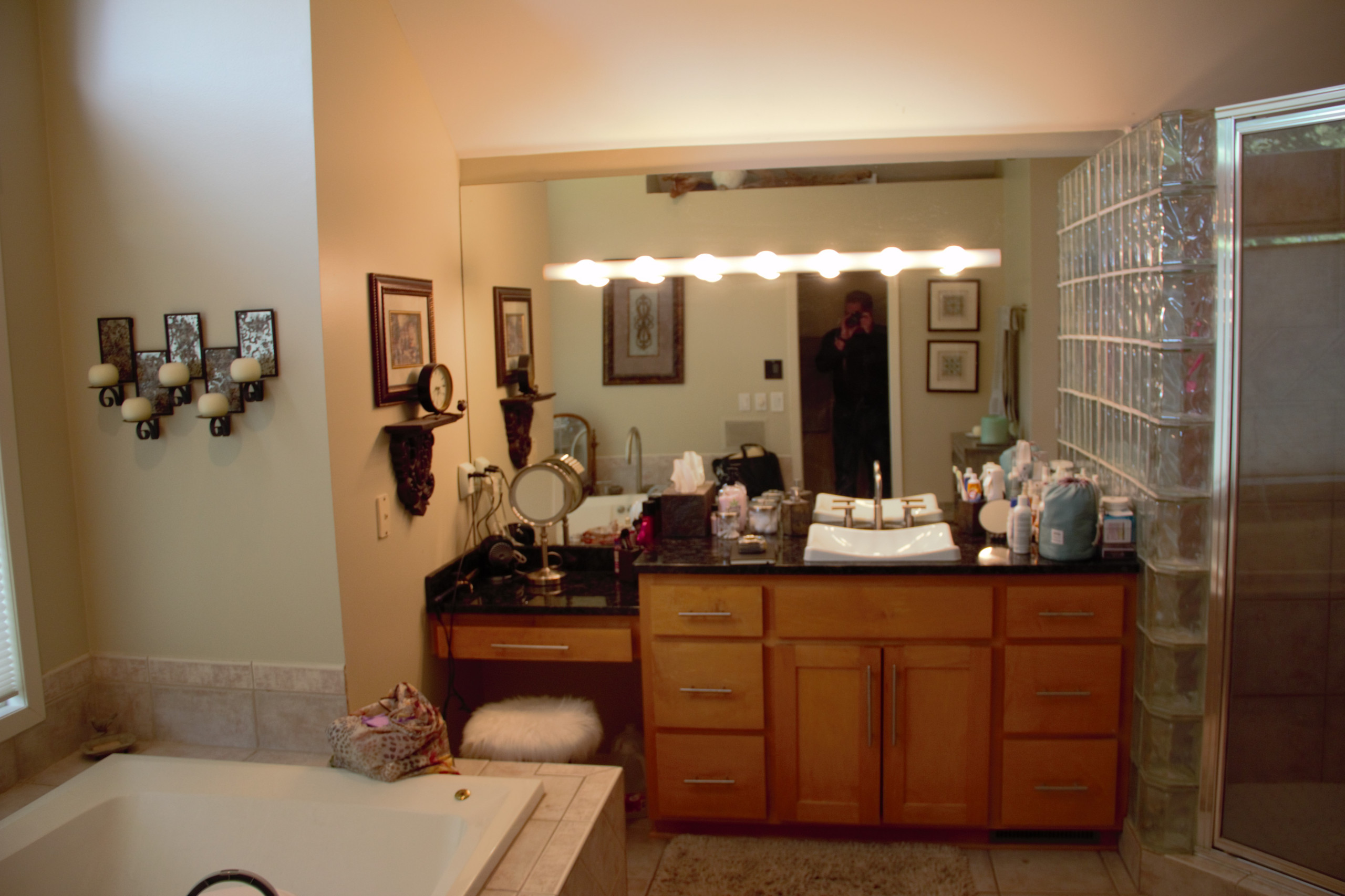 Before: The former bathroom had a tight layout with a massive built-in tub on the left, a glass-block corner shower and a cramped single-sink vanity with a small makeup area. A vaulted ceiling created awkward angles. The style — basic tile flooring, beige finishes and a black granite countertop — felt dated. And a lack of storage meant the couple kept many items out in the open. “The tub took up too much space and dominated the room,” Lundin says. “It wasn’t particularly attractive, either. She was actually storing a hair dryer in that tub.”