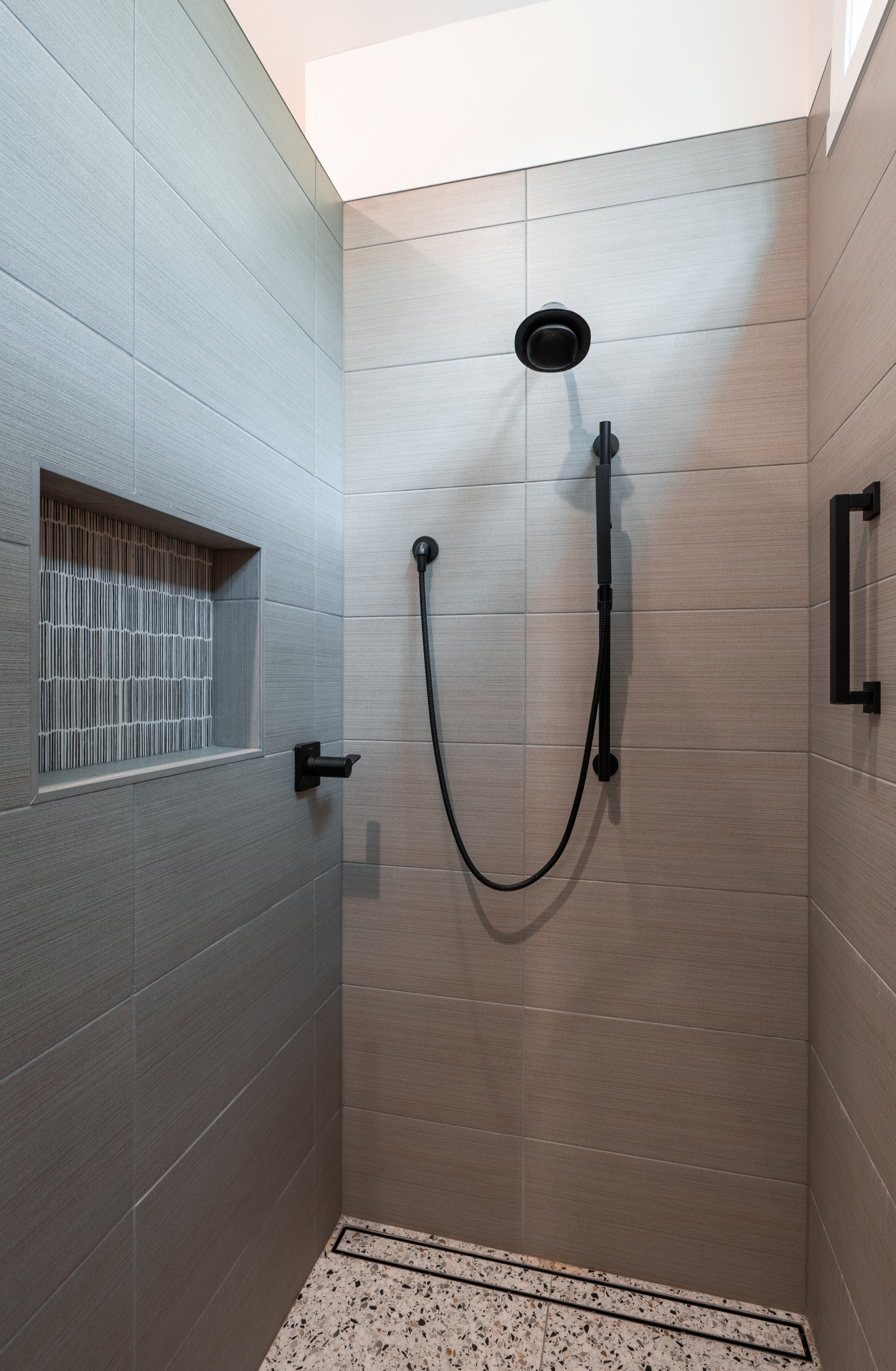 A pressure-balanced shower system with a modern matte black shower head, hand shower with a slide bar and lever handles provides flexibility when showering. A matte black grab bar on the right is an aging-in-place feature for safety. A niche lined with the same tiles used on the wall behind the vanity keeps bathing products off the shower floor, which consists of terrazzo-like porcelain tiles with a textured finish. “We also have a linear shower drain in there. That’s almost standard now,” Lundin says.